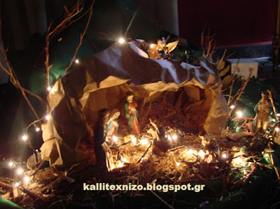 Η τεχνική απλούστατη.Το κομμάτι από τη χαρτόκουτα το κάναμε βάση, τσαλακώσαμε το κραφτ χαρτί και κολλήσαμε με σιλικόνη δίνοντας σχήμα.